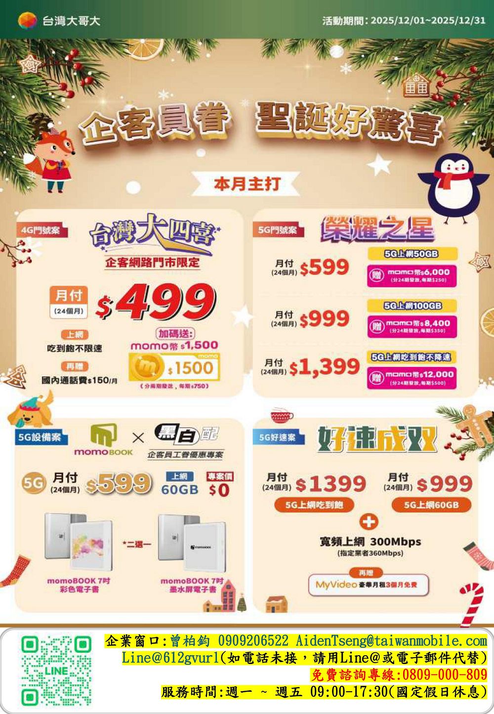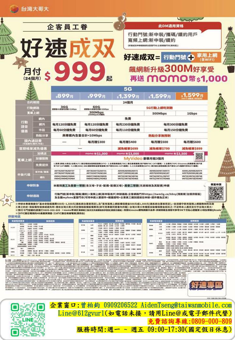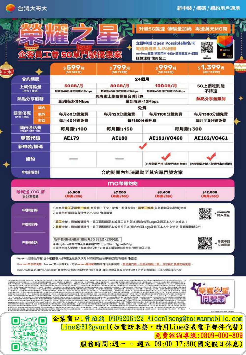 立即申辦-企客網路門市https://twm5g.co/zgC9 輸入統編 26883457 申辦相關問題可洽詢專屬企業窗口: 曾柏鈞 Aiden Tseng aidentseng@taiwanmobile.com LINE ID: @612gvurl 服務時間:週一∼週五 9:30~17:30 (國定假日休息)